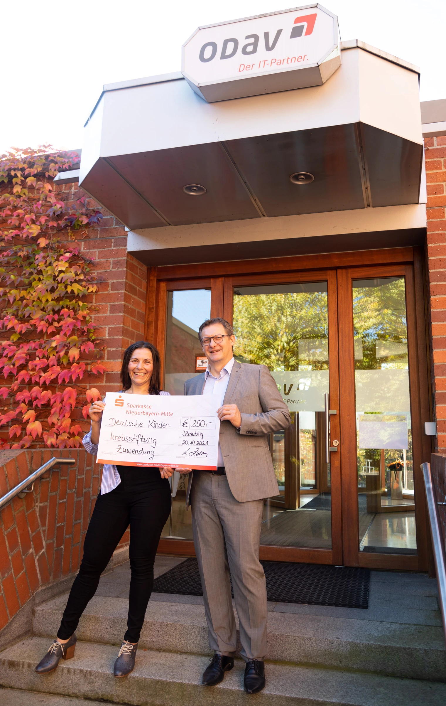 Für ihr großes Engagement im Rahmen der Spendenaktion überreichte Karl Zollner, Vorstandsvorsitzender der ODAV AG, seiner Mitarbeiterin Viorica Hegedüs einen Scheck im Wert von 250 Euro.